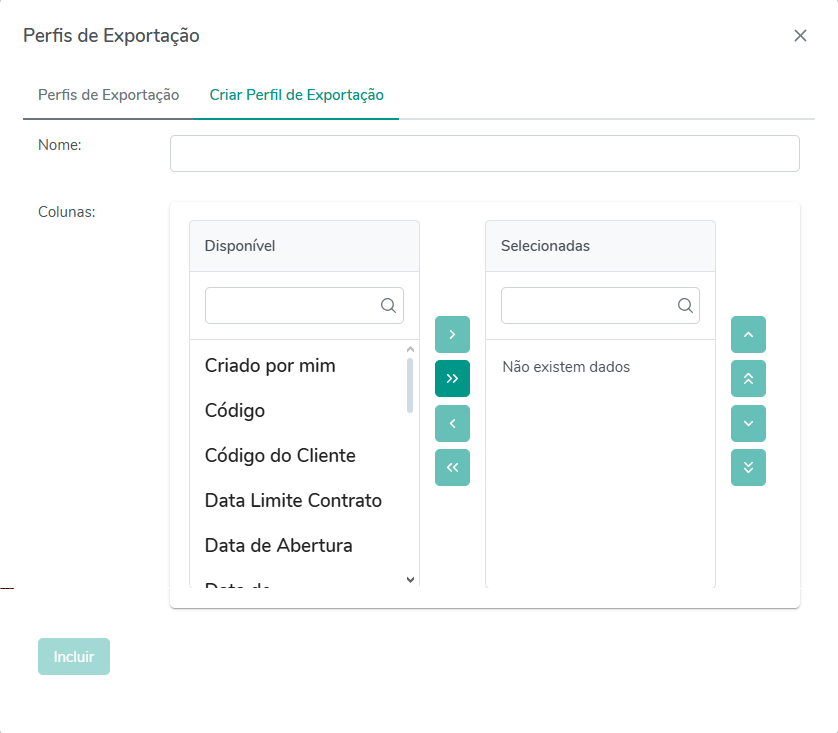 Selecionando a opção Criar Perfil de Exportação, basta definir um nome para o perfil criado com as aƧƵes desejadas e incluir. A coluna DisponĆvel mostra os campos disponĆveis para criação do perfil e a coluna Selecionadas mostra os campos escolhidos pelo usuĆ”rio, basta arrastar e soltar ou selecionar os campos desejados e clicar na seta >.