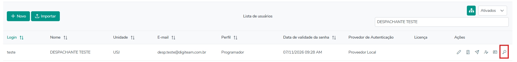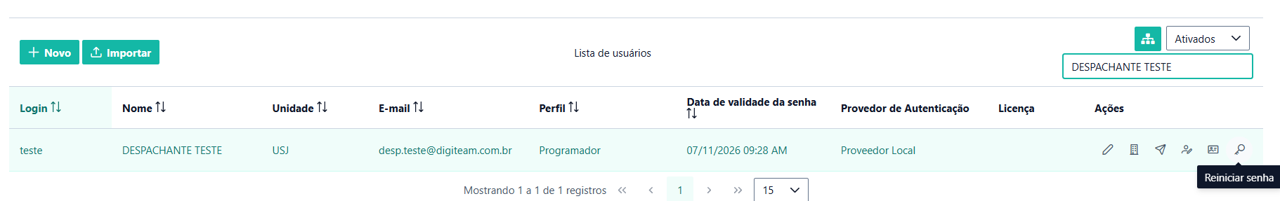 O Digiteam gerará uma senha sempre que um novo usuário for cadastrado ou quando a senha for reiniciada, em caso de esquecimento. Todo este procedimento é feito na tela de USUÁRIOS indo em SEGURANÇA -> USUÁRIOS.