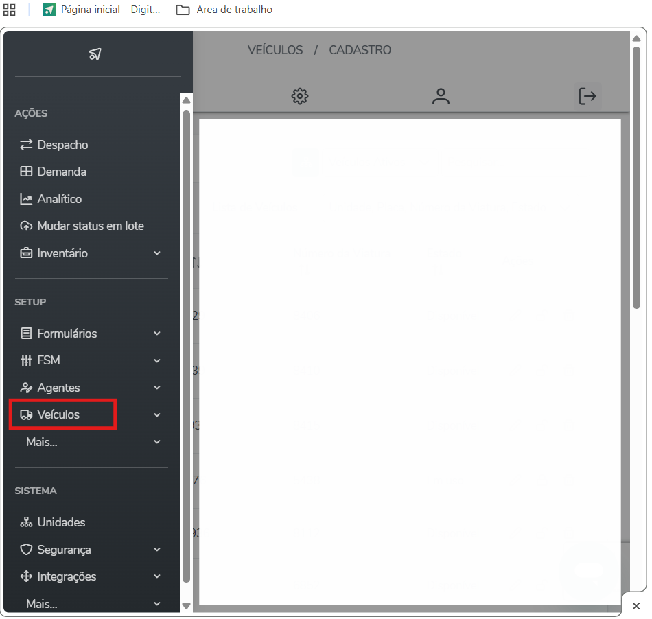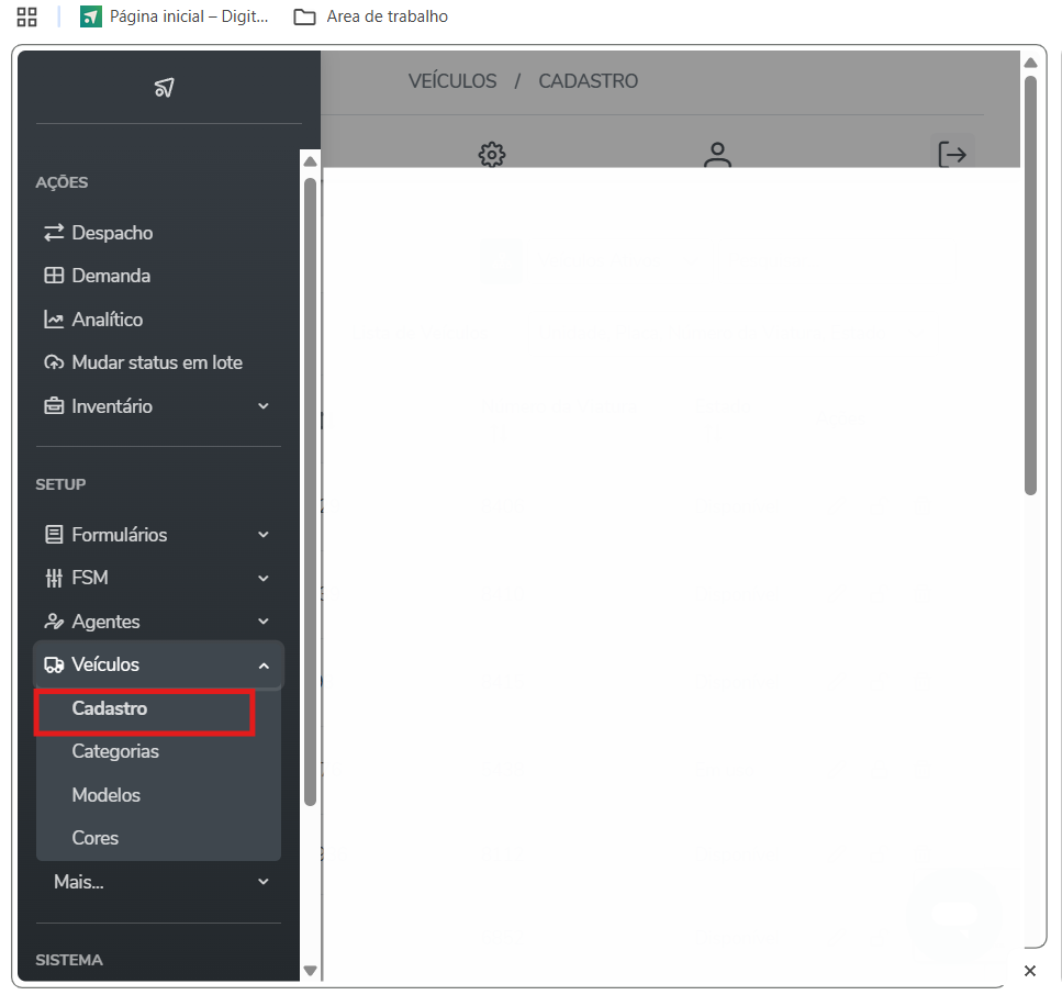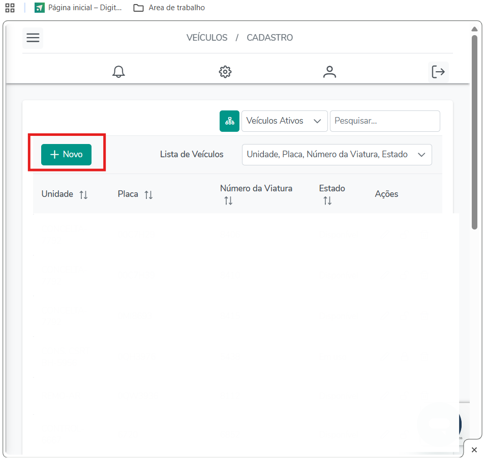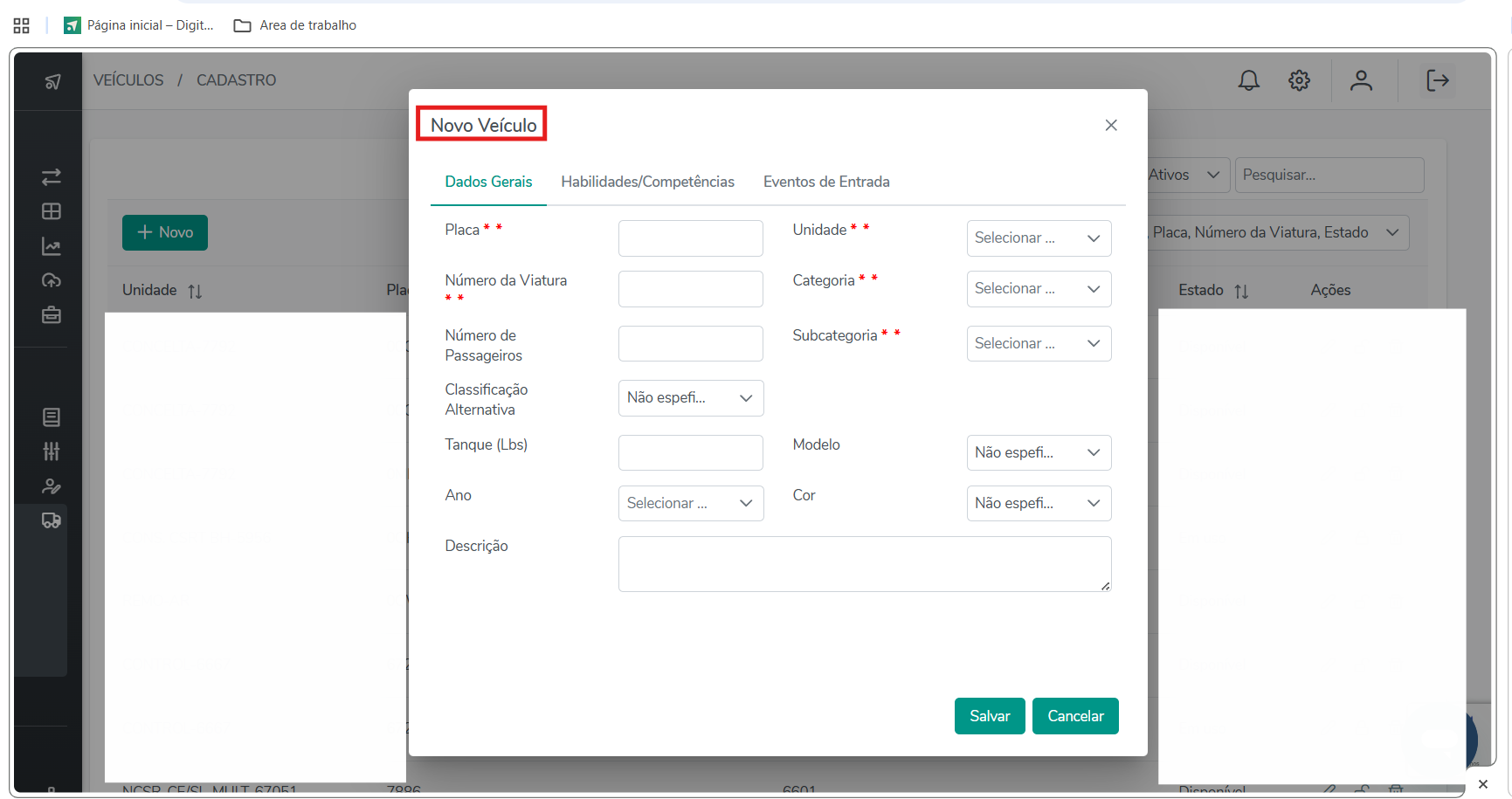 📍 MENU LATERAL > VEÍCULOS > CADASTRO > NOVO