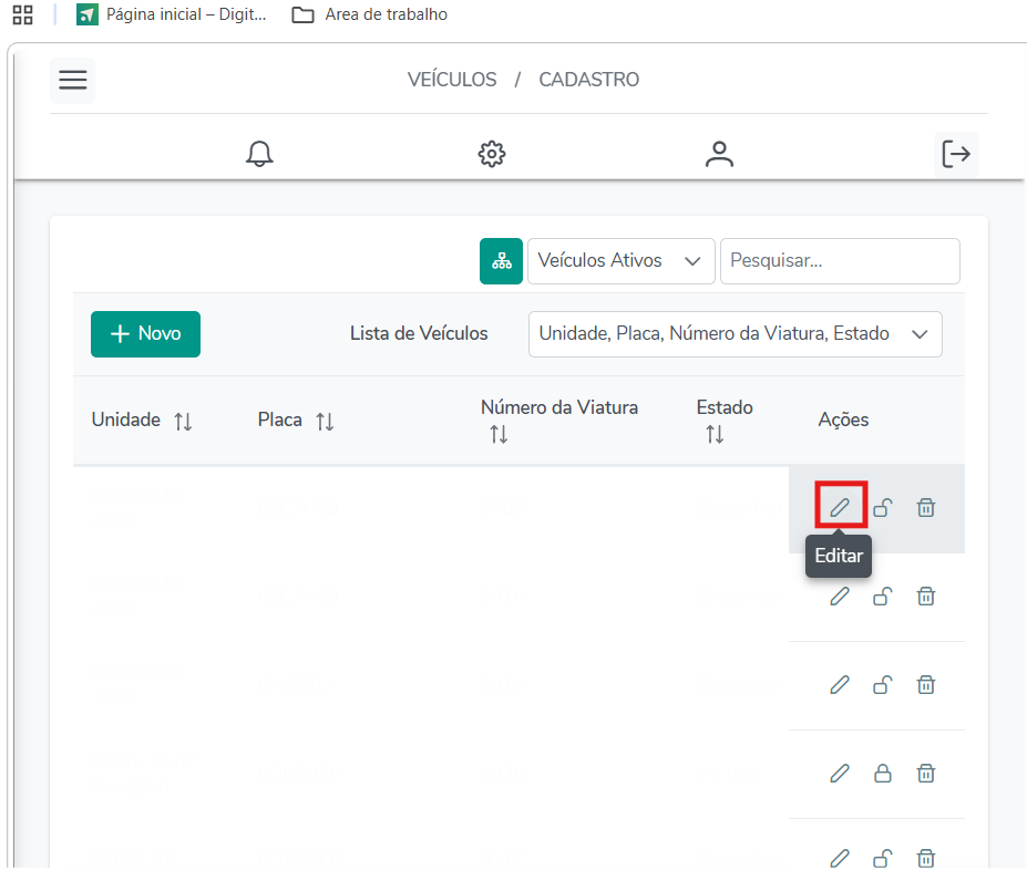 Para editar ou excluir um veículo, basta clicar no ícone correspondente na barra de ações.