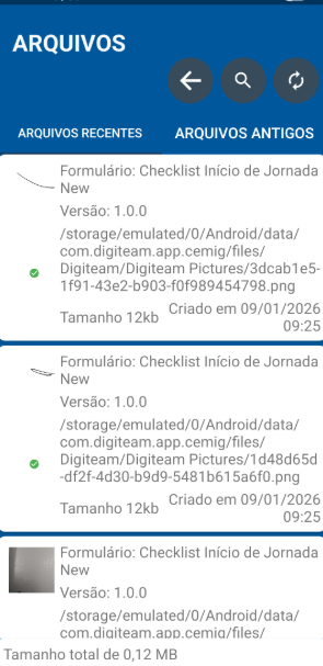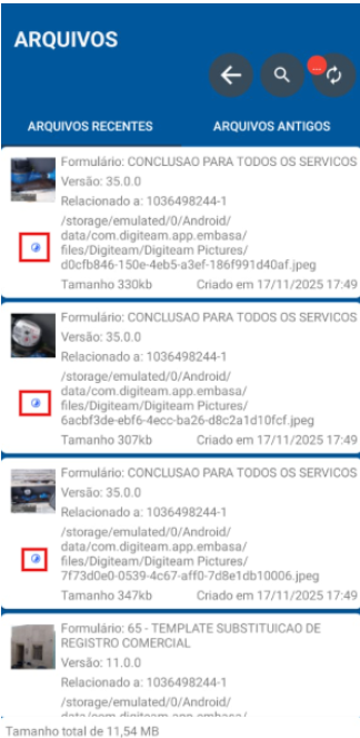 Caso as assinaturas, ou demais imagens coletadas não tenham sido carregadas do aplicativo móvel do agente de campo para o Digiteam web, é possível realizar este reenvio através da opção "Arquivos" .