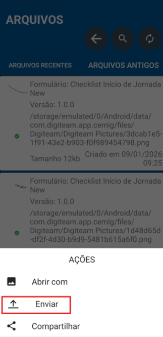 - Se sua imagem estiver em ARQUIVOS RECENTES ao clicar sobre a imagem aparecerão alguns comandos como: abrir com, compartilhar e enviar, deve-se clicar no botão Enviar. Caso o serviço tenha sido realizado em datas anteriores, busque na aba ARQUIVOS ANTIGOS.