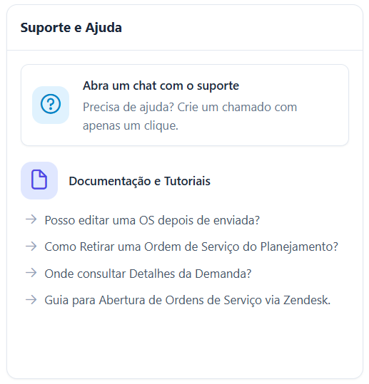 Em Suporte e Ajuda, ficam disponíveis o chat para abertura rápida de chamados e a documentação com tutoriais e respostas para dúvidas frequentes, incentivando o autoatendimento.