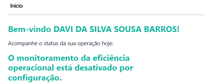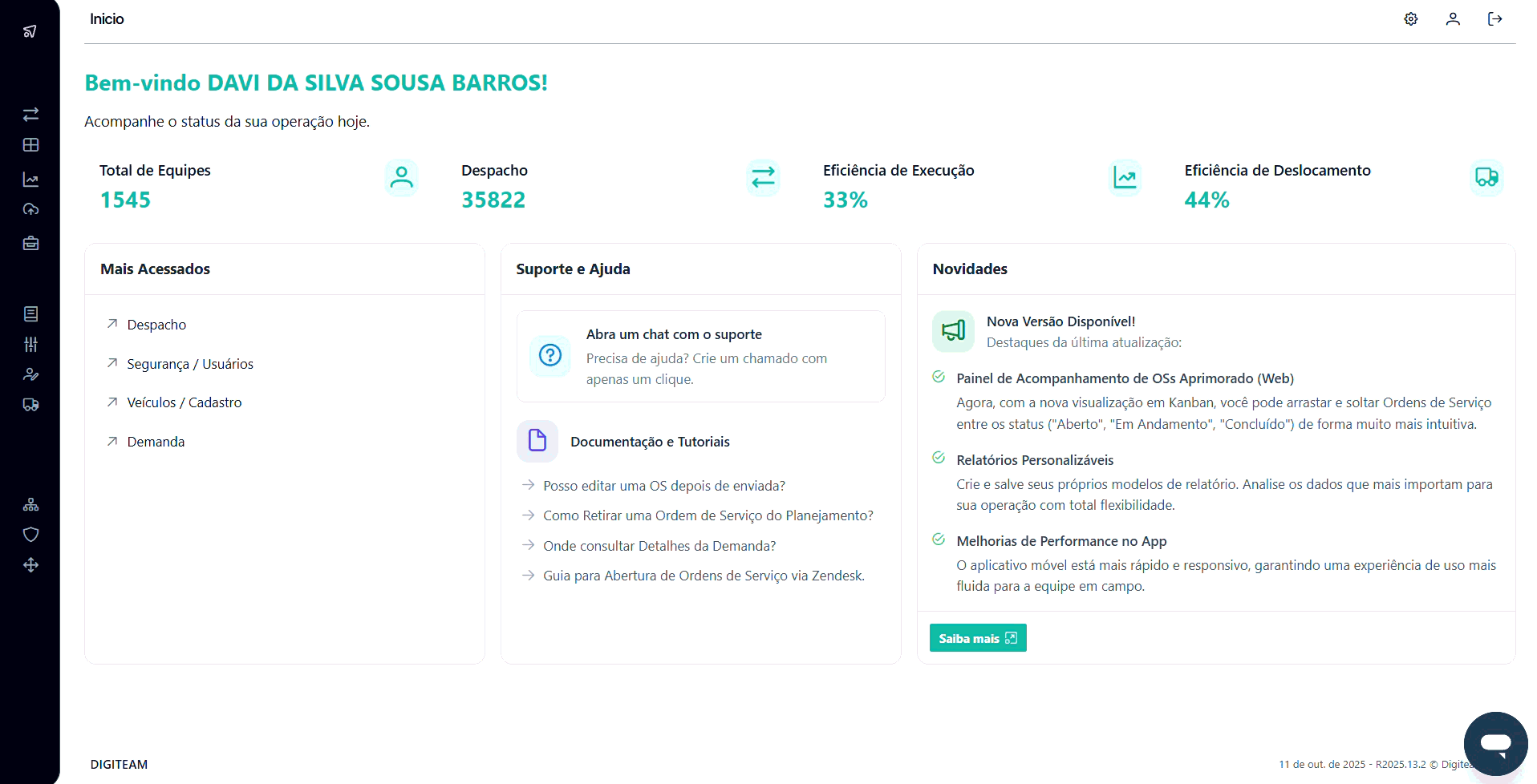 A nova Home do Digiteam foi reorganizada para tornar o acesso às informações mais rápido e intuitivo. No topo, o usuário visualiza uma saudação personalizada e um panorama da operação, incluindo alertas importantes, como o monitoramento de eficiência desativado (Visualização na imagem abaixo). - Verifique disponibilidade via Suporte Digiteam.