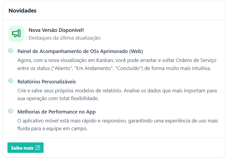 Já o quadro de Novidades apresenta os destaques das atualizações do sistema, como melhorias no painel de OS, novos relatórios e otimizações de desempenho, com acesso ao detalhamento pelo botão Saiba mais.