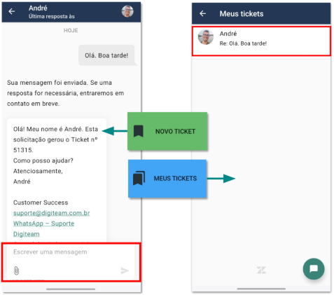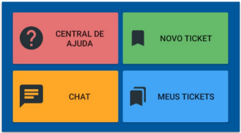 A opção de “NOVO TICKET” é usada para abrir uma nova solicitação de suporte. Diferentemente do chat, o novo ticket permite ao usuário sair do aplicativo sem
