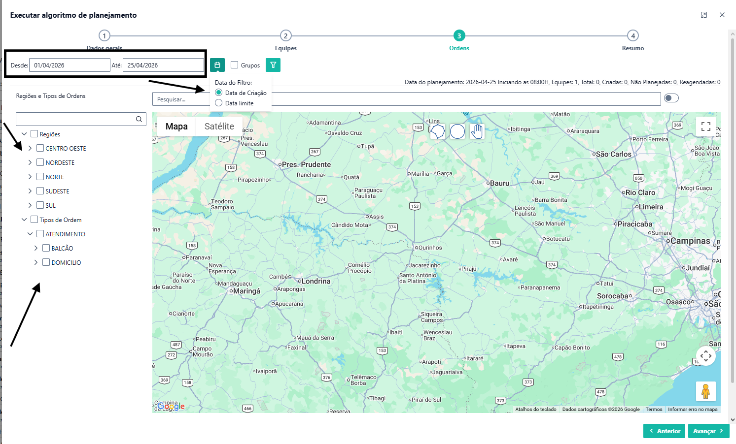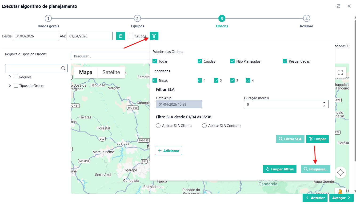 Na parte REGIÕES e TIPOS DE ORDEM é possível selecionar as regiões e o tipo de ordem para visualização.