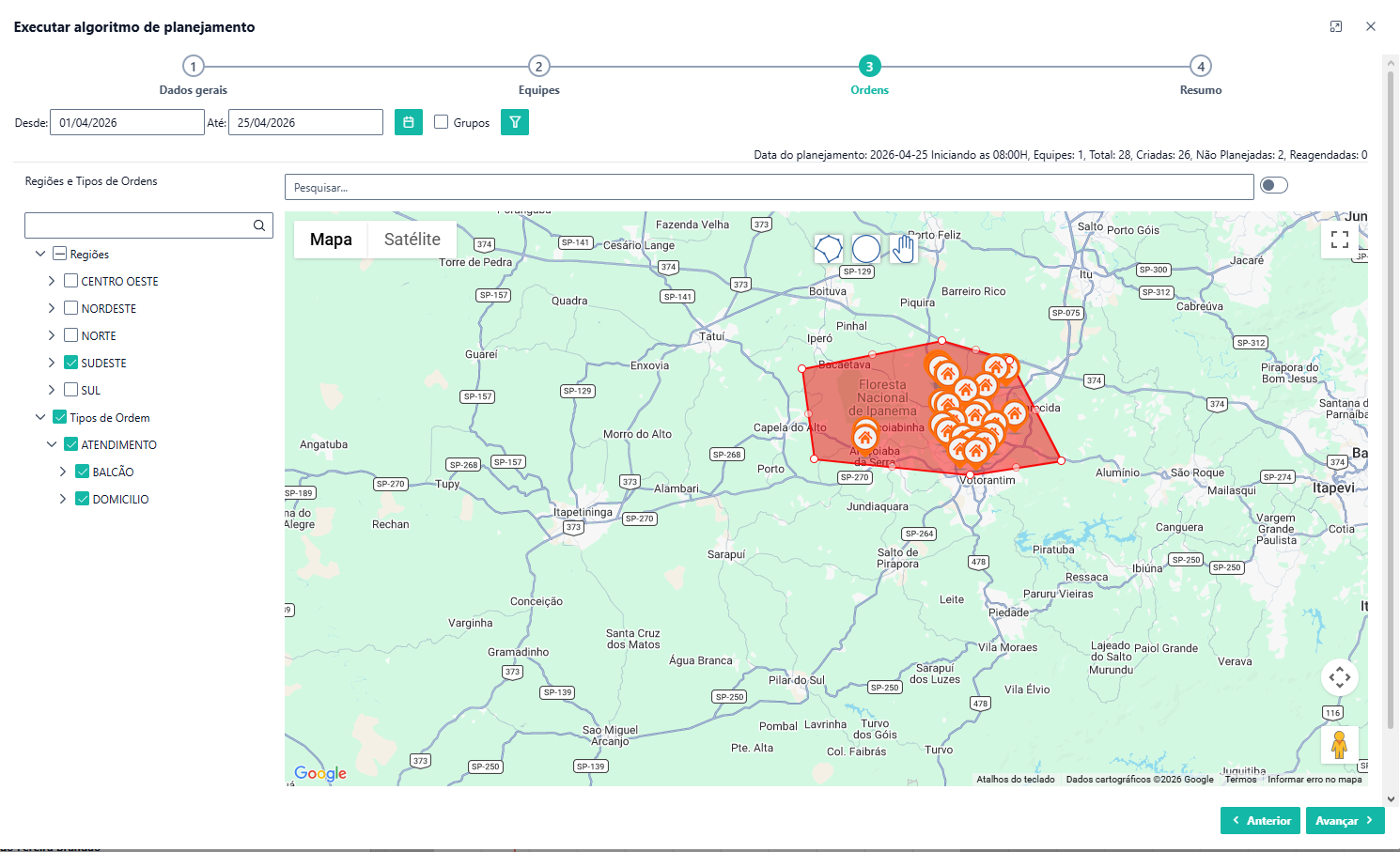Utilizando as ferramentas de polígono ou círculo, você pode definir a quantidade de ordens que cada equipe receberá. Após realizar os ajustes, clique em "AVANÇAR" para seguir para a próxima etapa.