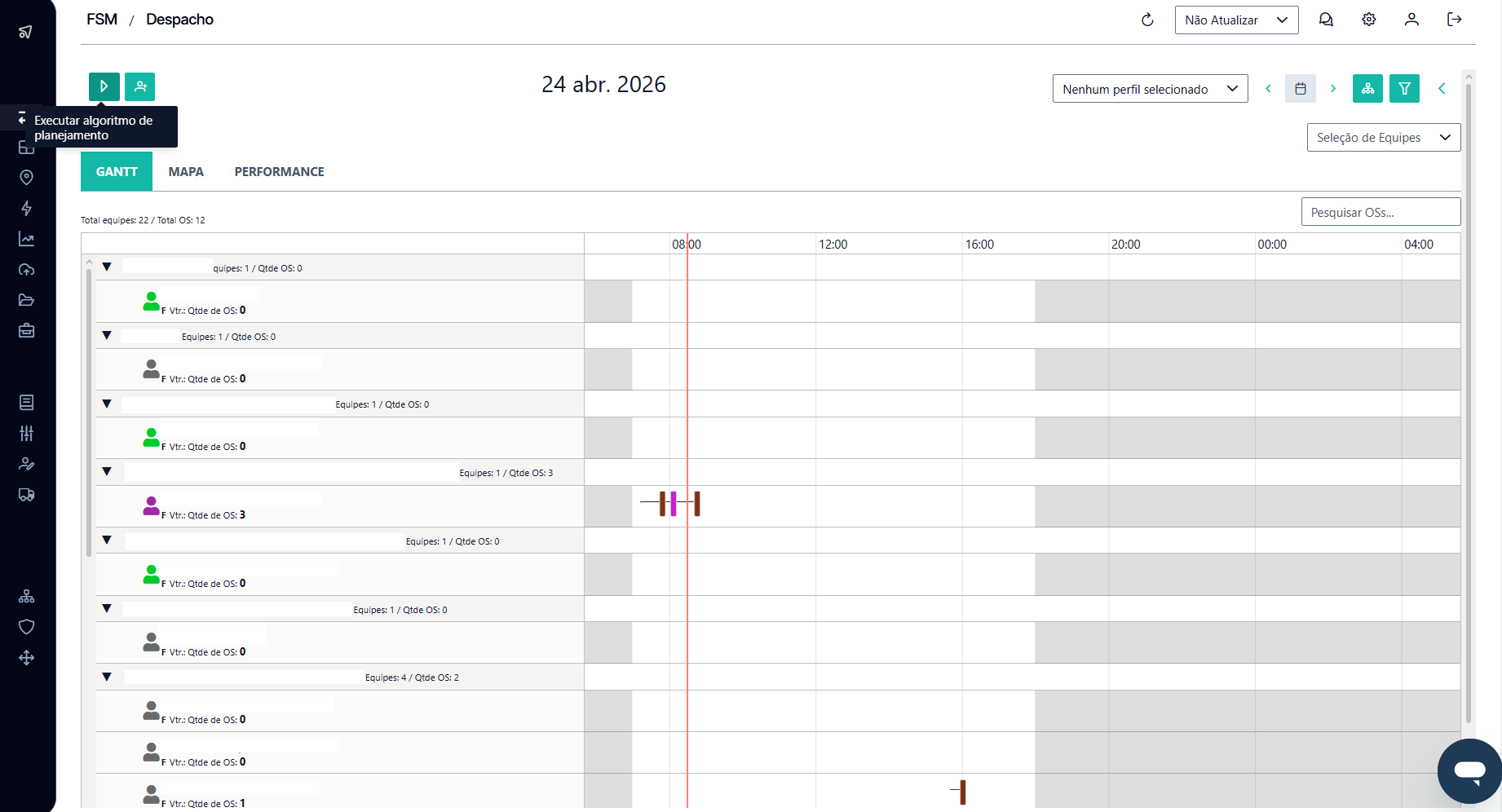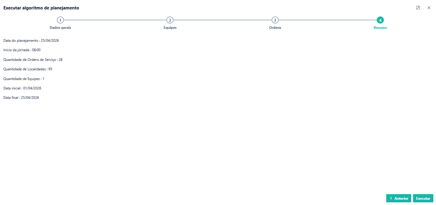 A última etapa consiste na apresentação de um resumo do planejamento. Verifique os dados e, se tudo estiver correto, clique em "EXECUTAR". O planejamento será exibido na timeline das equipes na tela de despacho.