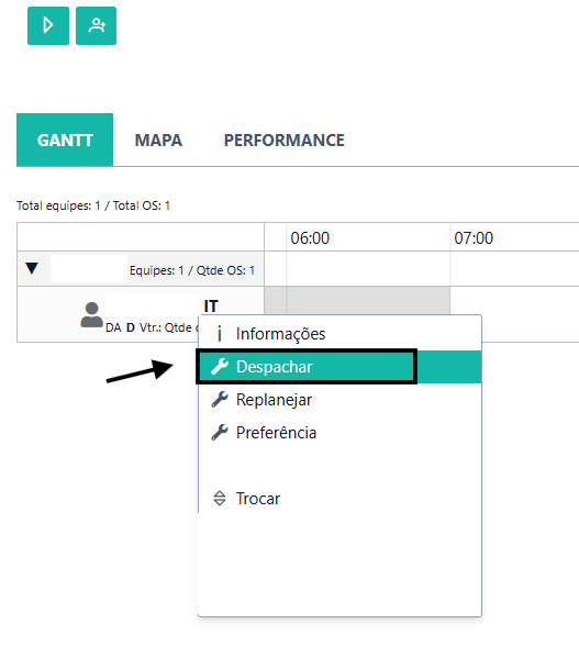 Será necessário que você vá na data que planejou, e clique com o botão direito do mouse em cima da equipe e clique na opção "DESPACHAR":