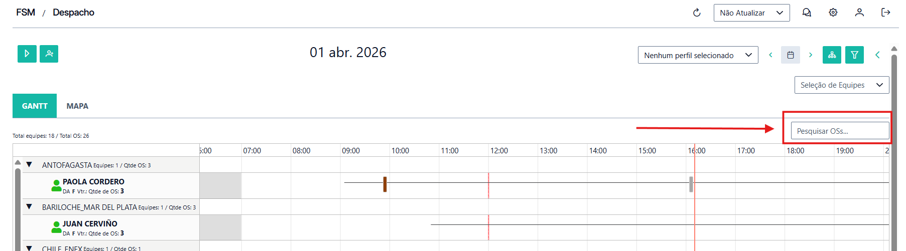 MENU LATERAL > DESPACHO (Timeline dos Agentes de Campo)>CAMPO PESQUISA (Indicado pela Seta)